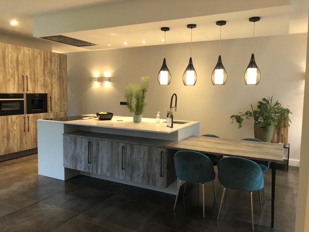 Deze ruime Schmidt keuken combineert koken, tafelen en gezelligheid in één uitnodigende ruimte. Het kookeiland met aangebouwde eettafel vormt het hart van de keuken, terwijl de royale kastenwand zorgt voor veel bergruimte. Warme houtstructuren, zachte grijstinten en sfeervolle verlichting maken er een moderne, maar heel huiselijke leefkeuken van.